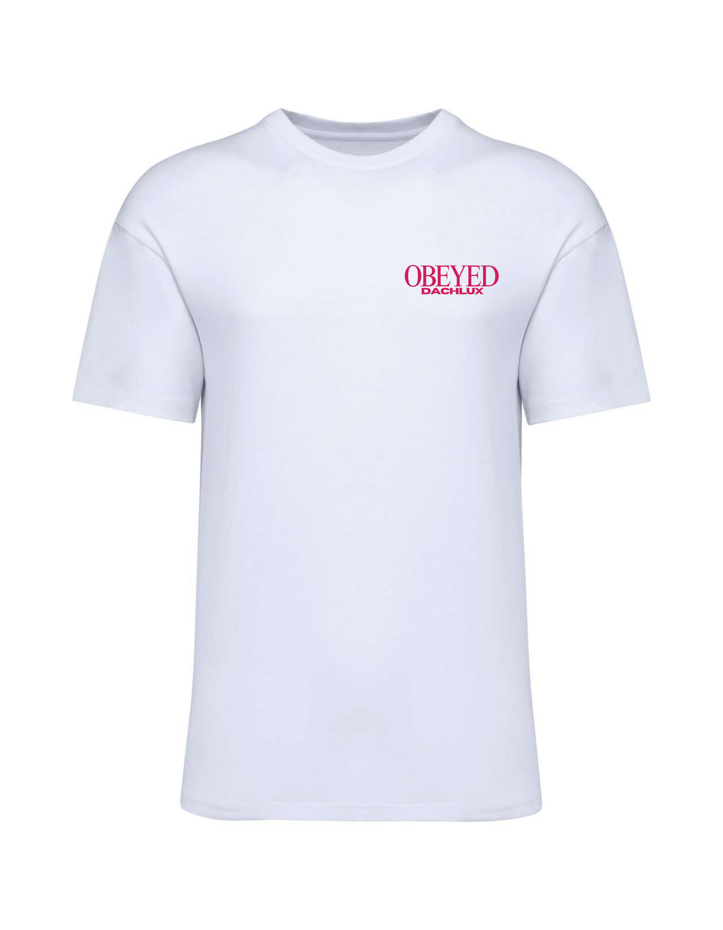 Az OBEYED kollekció alapdarabja, amely letisztult stílust képvisel. A fekete és fehér alapon magenta OBEYED / DACHLUX logó erőteljes kontrasztot ad, miközben a prémium Shoulder Loose szabás biztosítja a kényelmes, oversized hatást.